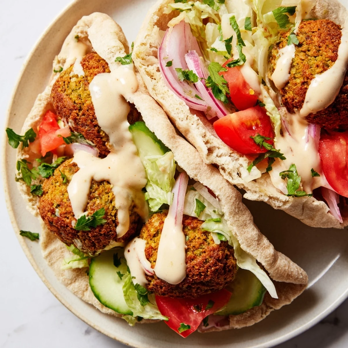 - Cut the warm pitas in half to form pockets, then layer in lettuce, tomatoes, cucumber, and red onion. Nestle 3–4 warm falafel into each pocket, drizzle generously with tahini sauce, and top with fresh parsley. Serve immediately while everything's still warm.