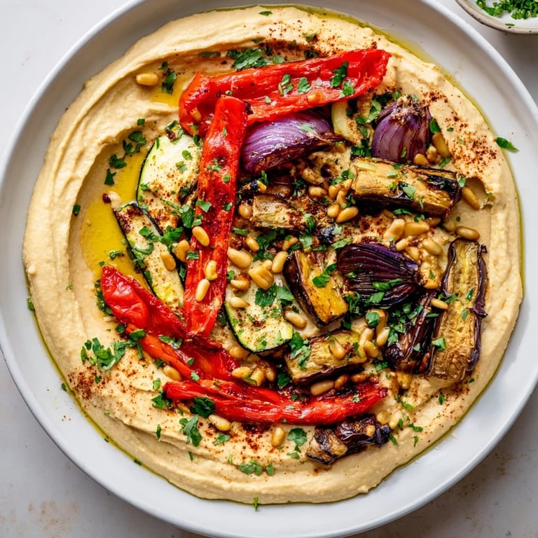 Serve this immediately while the vegetables still hold their warmth and texture against that cool, creamy base. If you're making it ahead, keep the hummus and vegetables separate and combine them just before serving. The hummus keeps for days in the fridge, actually becoming even silkier, while roasted vegetables are best fresh but will hold for a day or two.