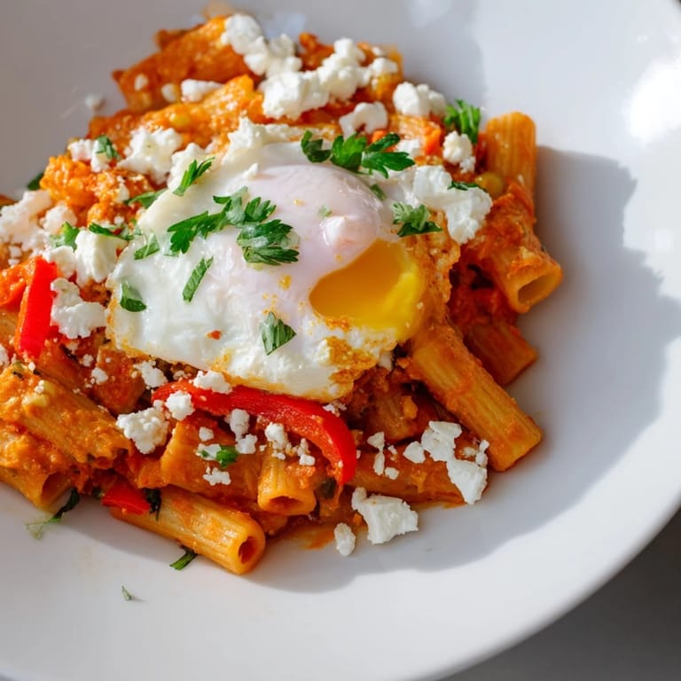 Save to Pinterest There's something magical about watching a skillet go from stovetop to oven and come back transformed. I discovered this dish on a Tuesday evening when I had leftover pasta, a can of tomatoes, and an inexplicable craving for eggs—not breakfast eggs, but something warm and savory that demanded to be baked. What emerged was pure comfort: pasta cushioned in a spiced tomato sauce with eggs nestled into the heat, their yolks still runny and ready to break into every forkful. It's become my go-to when I want something that feels both exotic and deeply familiar.