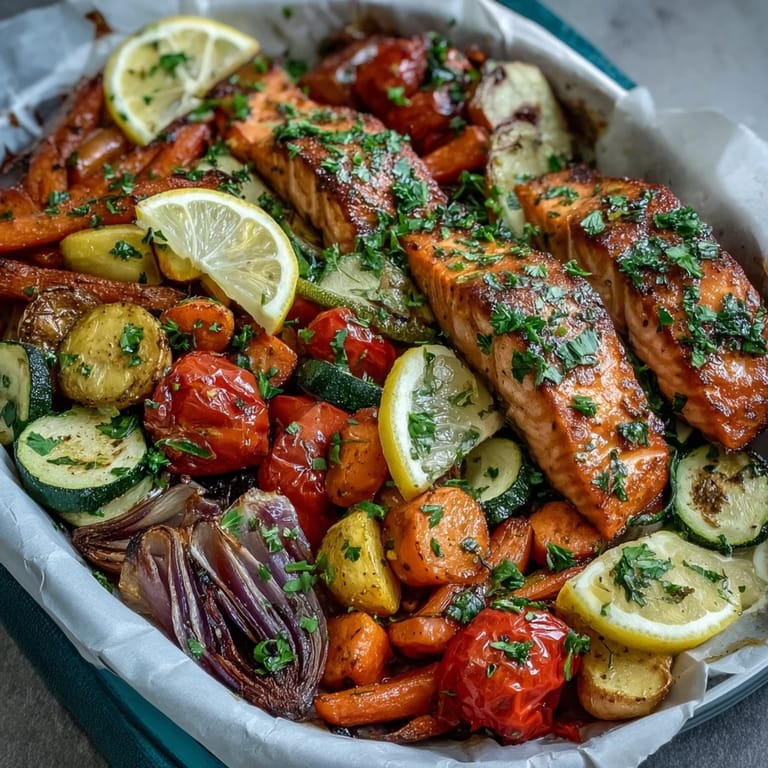 Save to Pinterest There's a moment in the last two minutes of roasting when you open the oven and the steam hits your face carrying all these roasted vegetable smells mixed with salmon, and you just know dinner is going to be good. My daughter wandered into the kitchen halfway through that night and didn't leave until it was ready to plate.