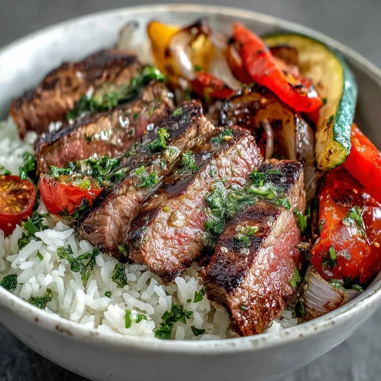 Save to Pinterest There's something about the smell of steak hitting a hot pan that makes everything else fade away. I discovered this sheet pan bowl one weeknight when I was tired of juggling three different cooking vessels and swearing under my breath about the mess I'd created. My partner walked in, wrinkled their nose at the chaos, and that's when it clicked—what if everything just happened on one pan? Turns out, the vegetables absorb all those beautiful steak drippings, the rice cooks untouched on the stove, and somehow the whole thing comes together like it was meant to be. Now it's become my go-to when people are coming over and I want to look like I've got my life together.