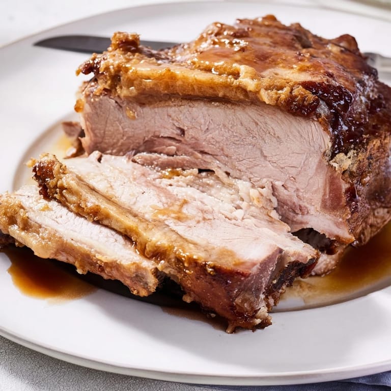 - Crank the oven to 425°F and brush the pork generously with the glaze. Roast for 20–30 minutes, brushing again halfway through, until the skin is deep bronze and crackling at the edges.